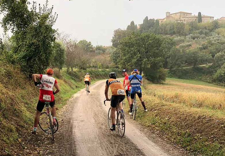 L`Eroica – heroisk og mytisk. Vakkert hyggelig og vilt. Bli med på en sykkelopplevelse utenom det vanlige, sammen med andre entusiaster. Turen går gjennom noen av verdens beste vinmarker, opp og ned på bygdeveier med «hvit grus», veier som virkelig setter rytteren på prøve. Men midt i noe av det tyngste du kan gjøre på en sykkel dukker det opp en «matstasjon» der du skal stemple ditt deltakerkort. Der serveres det Chiantivin og salami og en ostebit. Du møter folk fra hele verden som alle smiler og klapper deg på skulderen og roper «forza» i det du legger ut på neste strekning i det rullende vakre toscanske landskapet. Og etter en full dag med slit, smil, inntrykk og kanskje et og annet skrubb- eller gnagsår, venter Vasanello. Med «La pecora ladra» og en middag som overgår det meste du har spist til nå i ditt liv. Med tilhørende drikke. Og med historier og opplevelser som bare MÅ deles i gjengen. Når du endelig treffer sengen i Casa Etronia sovner du ikke, du besvimer.